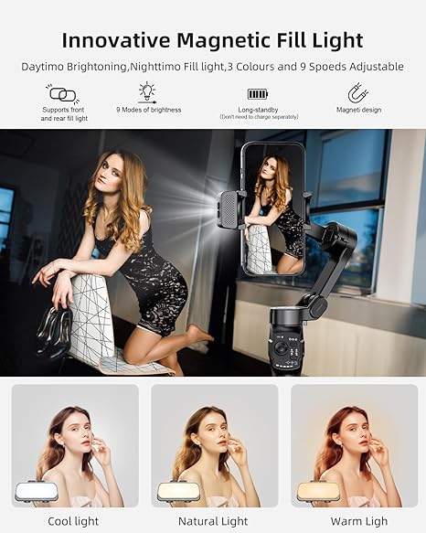 - Luz de relleno magnética: intercambiable entre frontal y trasera, con 3 tonos de luz y 9 niveles de brillo.