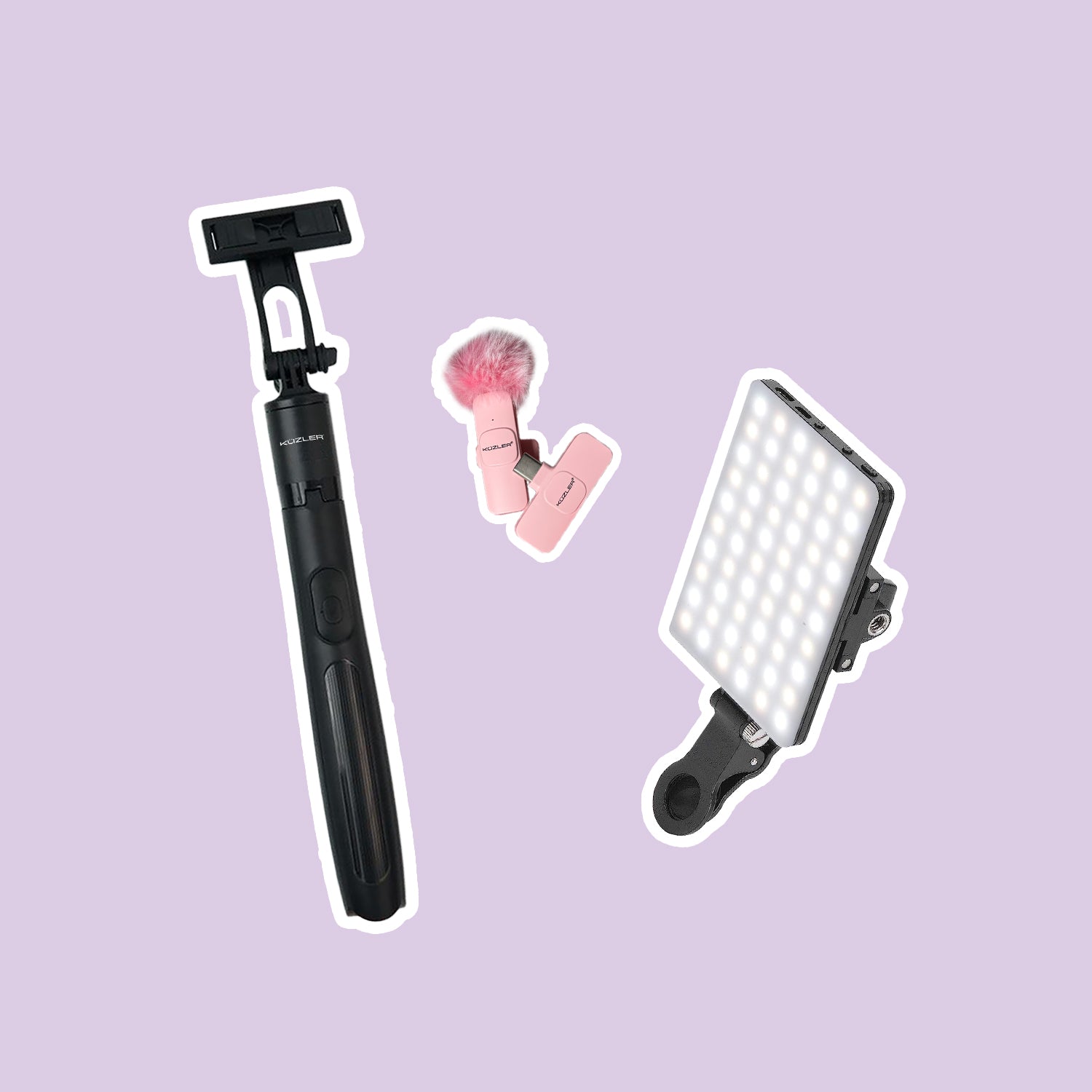 Pack: Trípode + Luz led + Micrófono Rosado para Celular
