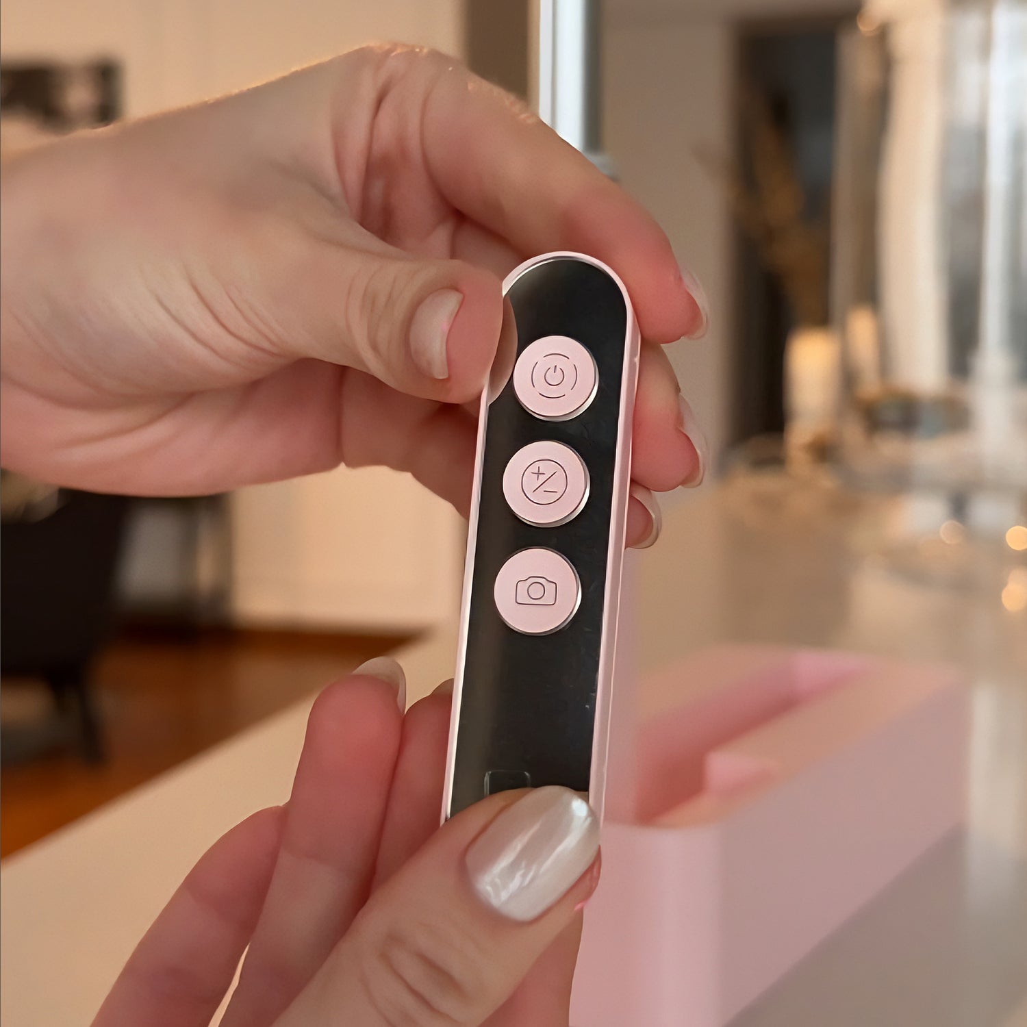 Cambia modos de luz, silencia o toma fotos con solo un clic desde el control integrado en la base del trípode.