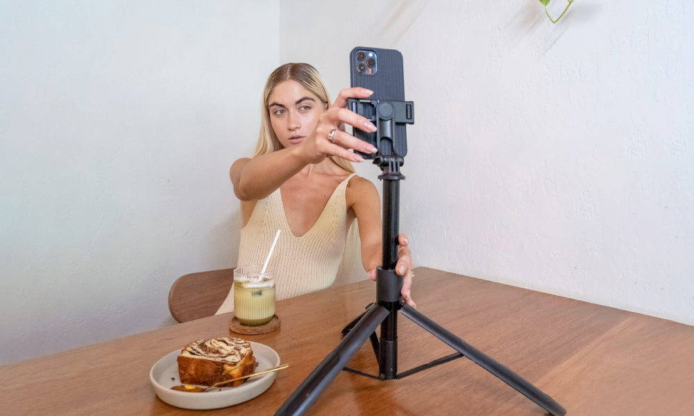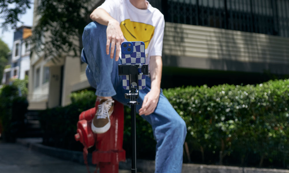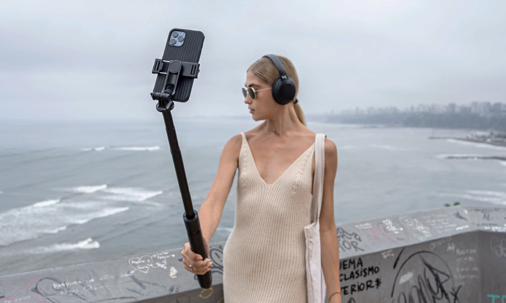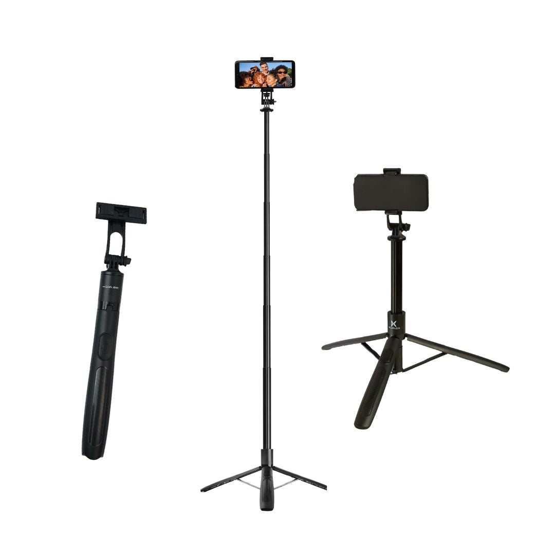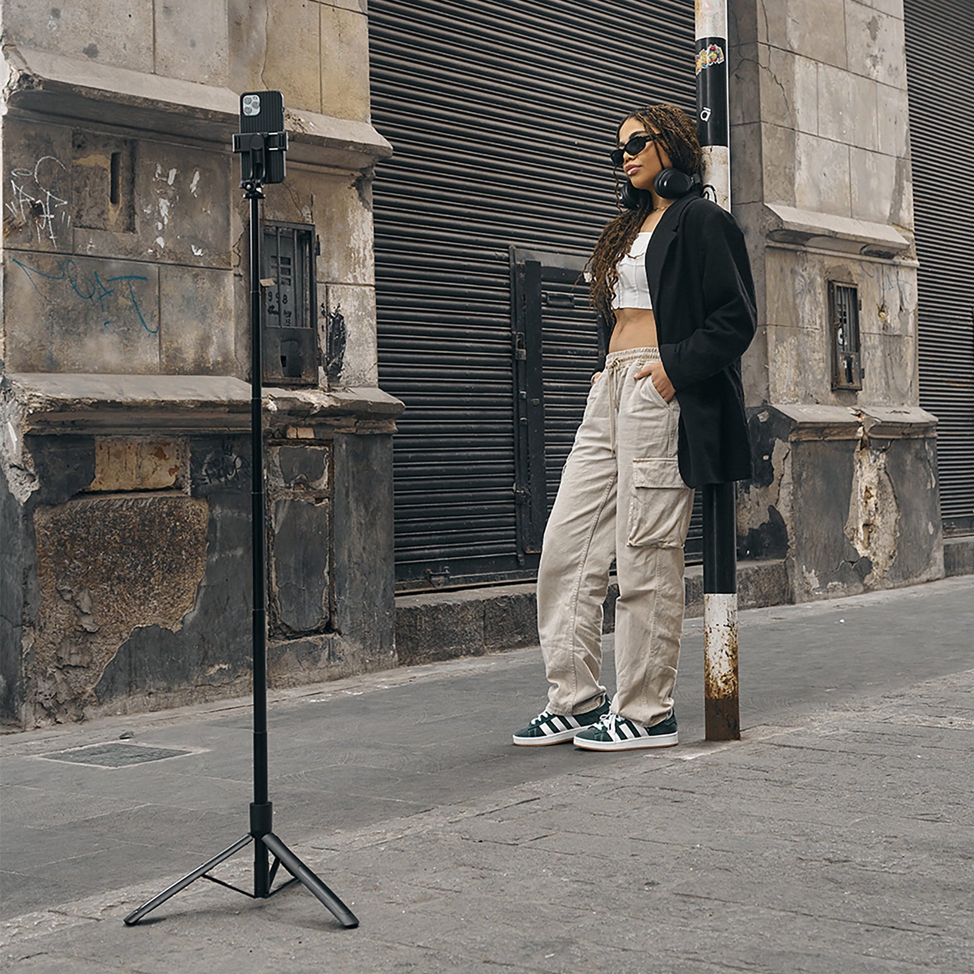 Úsalo como trípode estable para grabar o como selfie stick extendido para tomas amplias. Ideal para creadores en movimiento.